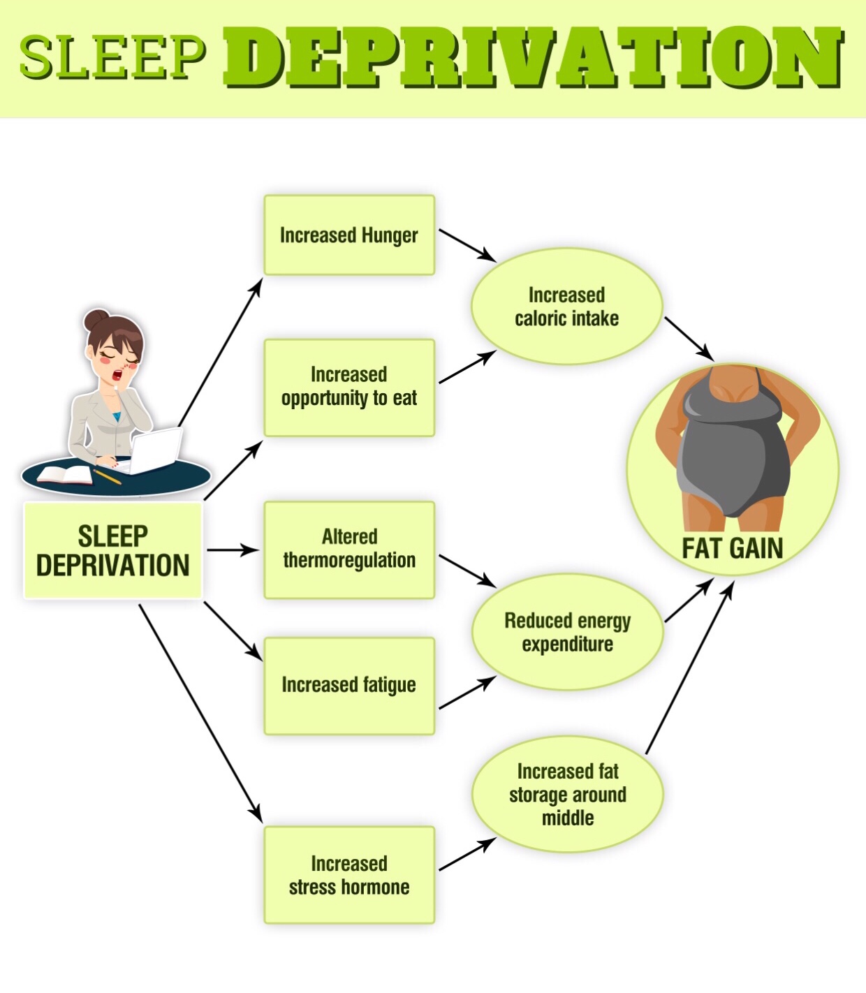 Achieving and maintaining a healthy weight is not simply a matter of calories in versus calories out. We now know that sleep deprivation is a major risk factor for becoming overweight and for obesity. Two hormones that control hunger and and fullness, leptin and ghrelin are directly affected by the amount of sleep we get. Leptin tells our brains to stop eating when we are full and ghrelin is an appetite stimulant. With sleep deprivation, we produce less leptin and more ghrelin. The imbalance in these hormones is thought to be responsible for late night snacking. The longer we are awake into the night, the more opportunities we have to overeat. An additional effect that poor sleep has on our weight loss efforts is to make it us too tired to exercise.